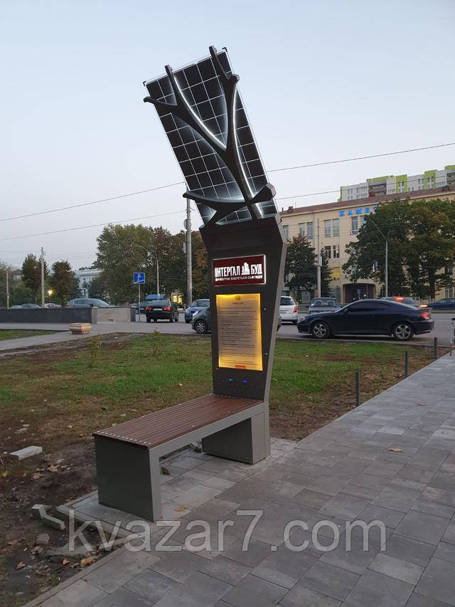 Компанія Квазар реалізувала проект з виготовлення і встановлення двох мультимедійних сонячних лавок у парку «Нивки» в Києві. Кияни та гості міста відтепер можуть послухати з десяток пісень про Київ та підзарядити свої гаджети. Живлення лавочок відбувається за допомогою сонячних батарей. Також у вечірній час лавочки підсвічуються і освітлюють простір довкола себе.